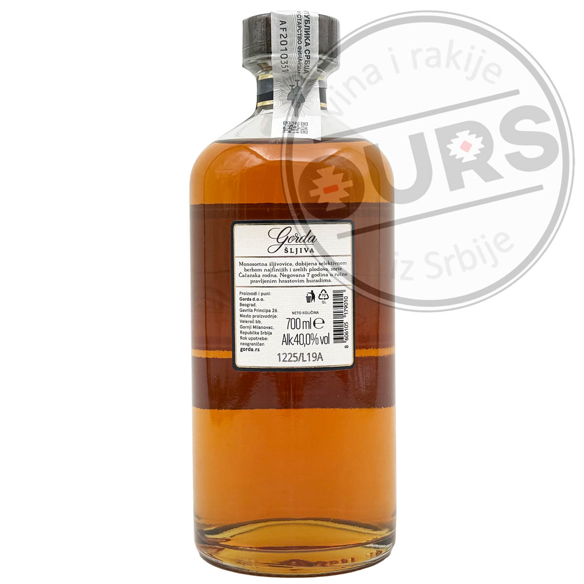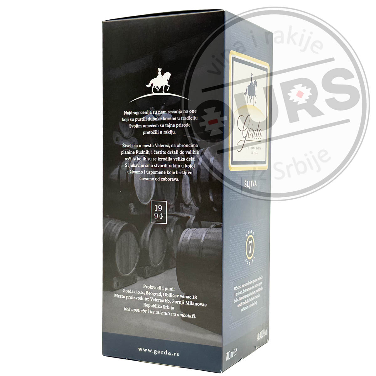 • Mekoća koja očarava ukusom i greje dušu. Gorda šljiva je više od rakije, ona je neponovljiv osećaj tradicije i umeća koje teče našim venama. Da bi se u samo jednom gutljaju doživela širina cele lepeze osećaja, našu rakiju pravimo od najboljih šljiva koje ručno probiramo na našim plantažama. Zahvaljujući prirodnoj fermentaciji, bez dodavanja selekcionih kvasaca i enzima, naša Gorda šljiva je potpuno prirodan proizvod. Bakarni sjaj i boja hrastovine nisu samo nijanse koje pronalazimo u flaši Gorde. Ova rakija se destilira u ručno pravljenim bakarnim kazanima da bi zatim sazrevala u burićima od cepane lagano topstirane hrastovine čak još sedam godina. Sedam godina strpljenja i još toliko ljubavi i znanja doprinose tome da se sve senzacije Gorde sad nalaze na vašem nepcu!